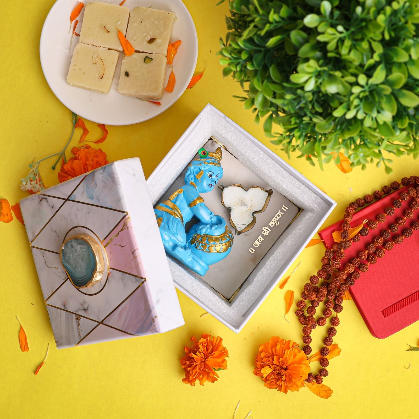 Laddu Gopal ( Lord Krishna) with 4 inches Marble Chowki. Comes with "Jai Shree Krishna" written on it to display in office or home. Luxuries box included to gift or store