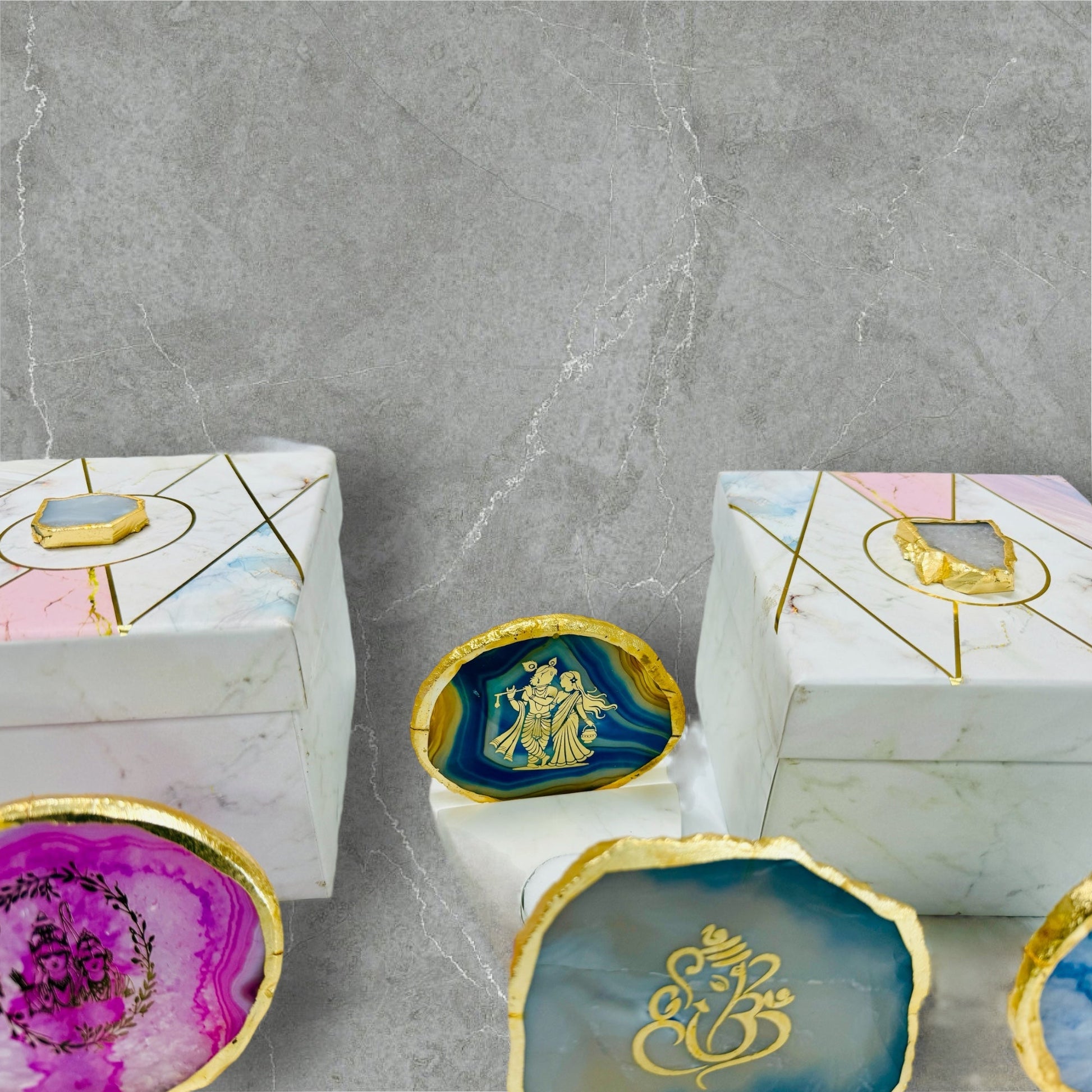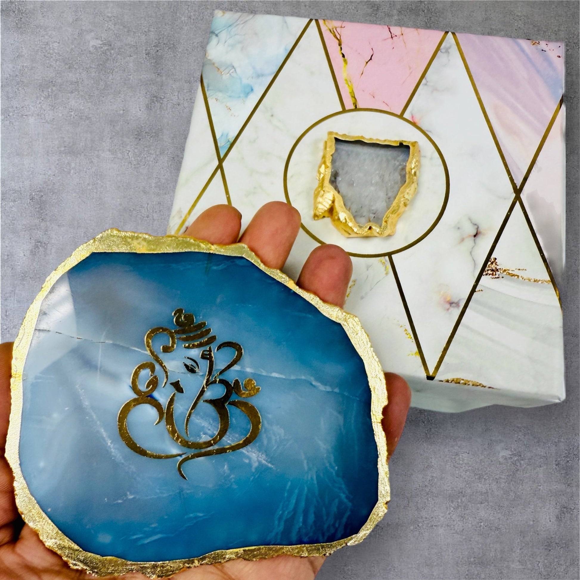 Real Gemstone Ganesh Ji Agate with Marble T Light Holder in marble print high quality gift box with agate embellishment. Perfect hostess gift, wedding gift or house warming gift. This stylish piece can be used as home decoration or added to your home mandir.