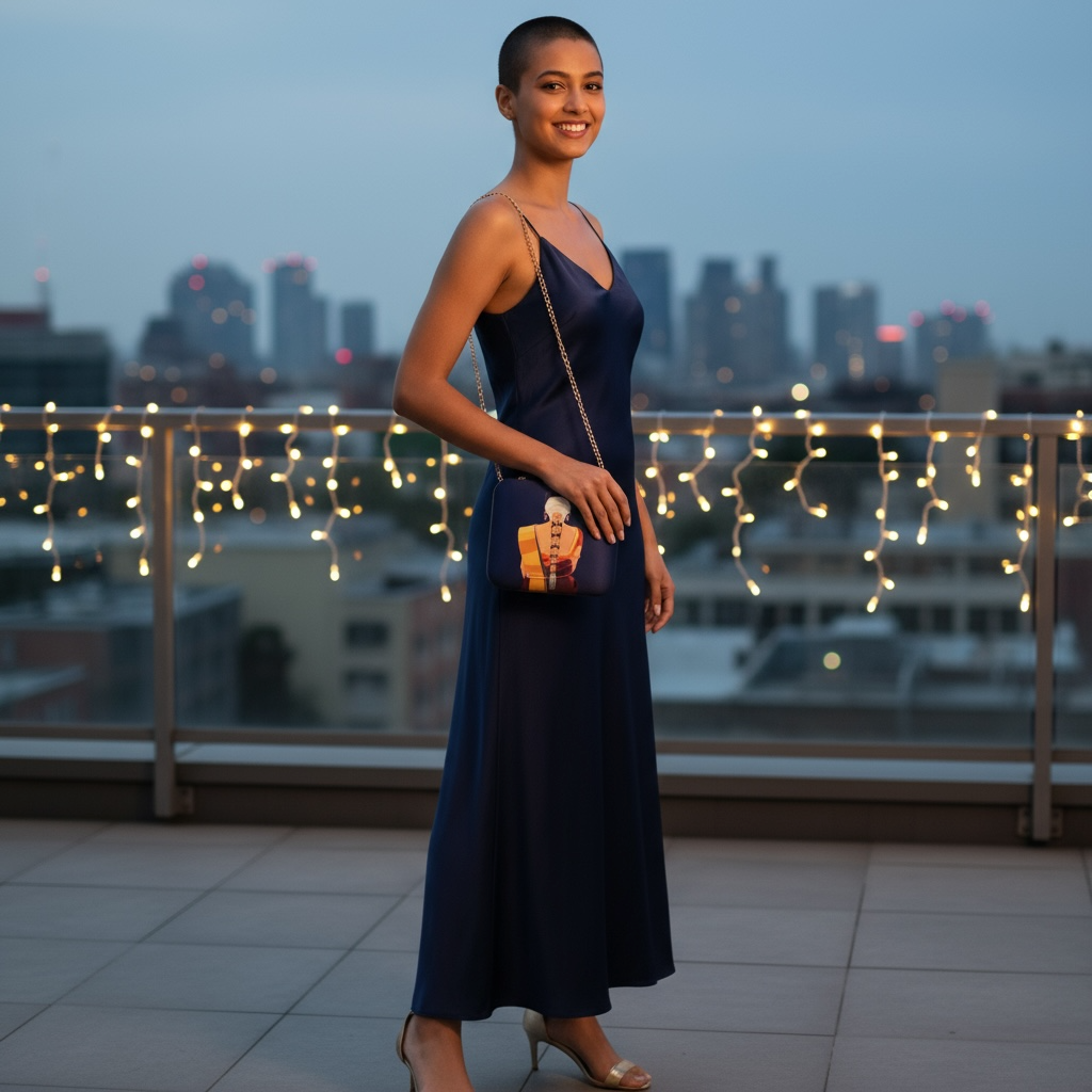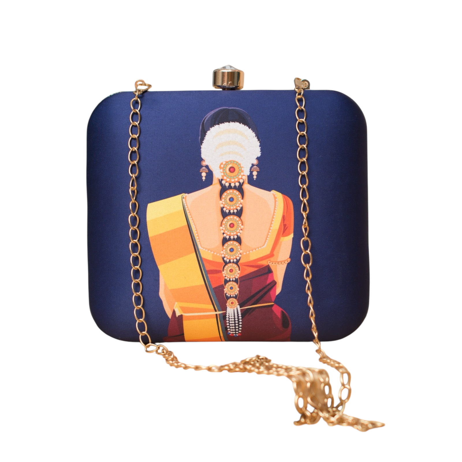 Indian design clutch with lady in sari with braided hair and gajra. It is very unique clutch that can be paired with both traditional and modern fashion.