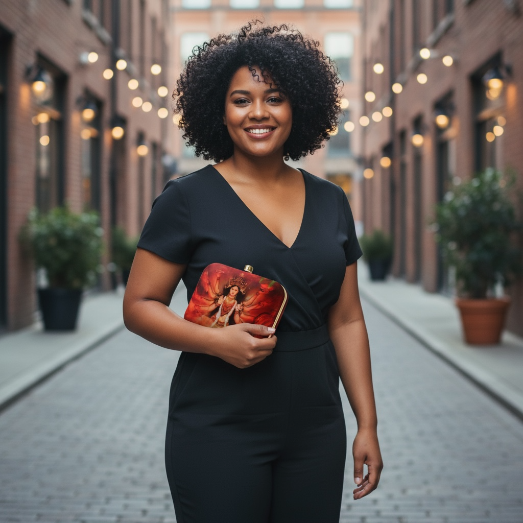 Indian design clutch with Maa Durga portrait. It is very unique clutch that can be paired with both traditional and modern fashion. A must have fashion accessory for your Navratri events