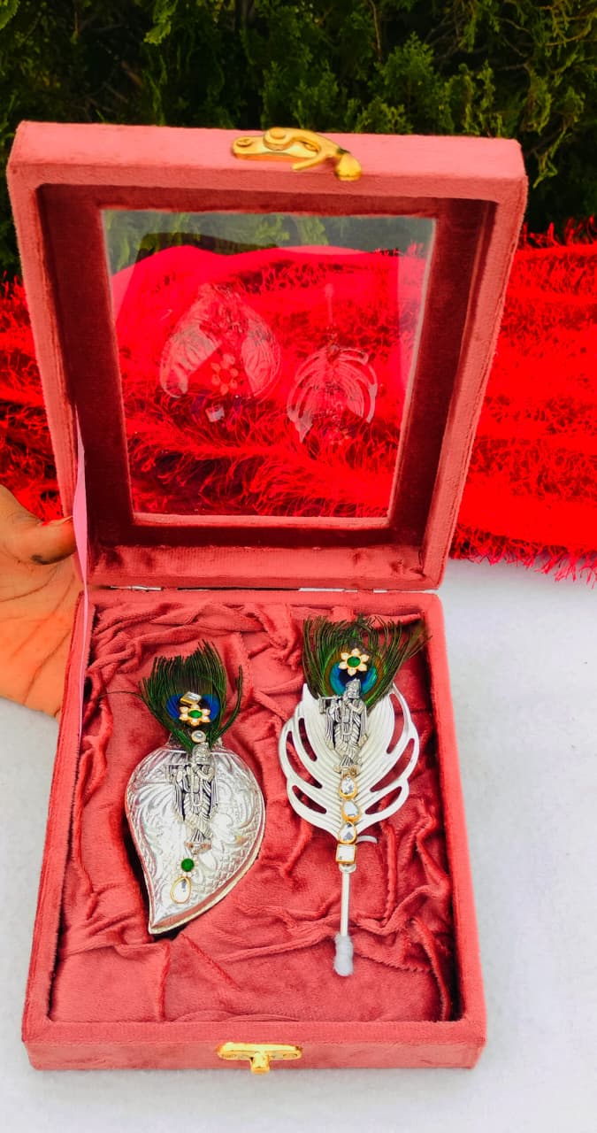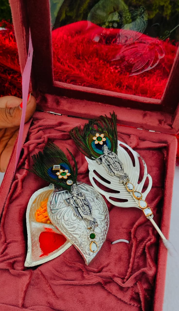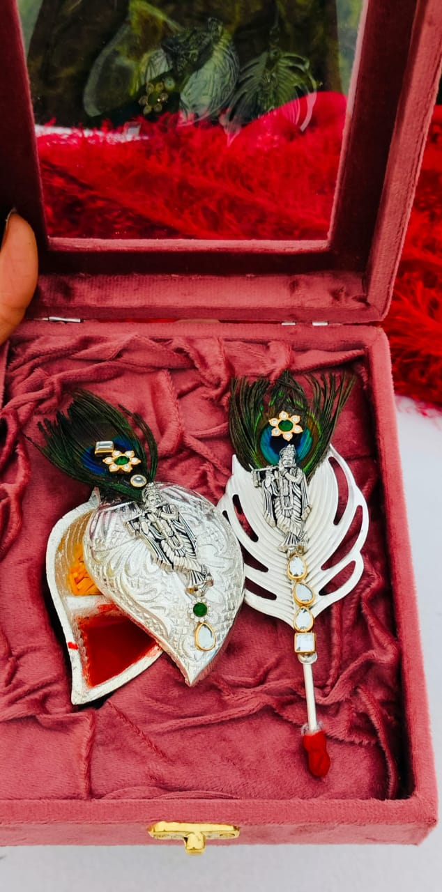 1. German silver kundan work with original peacock 🦚 feather flute krishna tilak stick & sliding cap Nakkashi work Roli chawal chopra