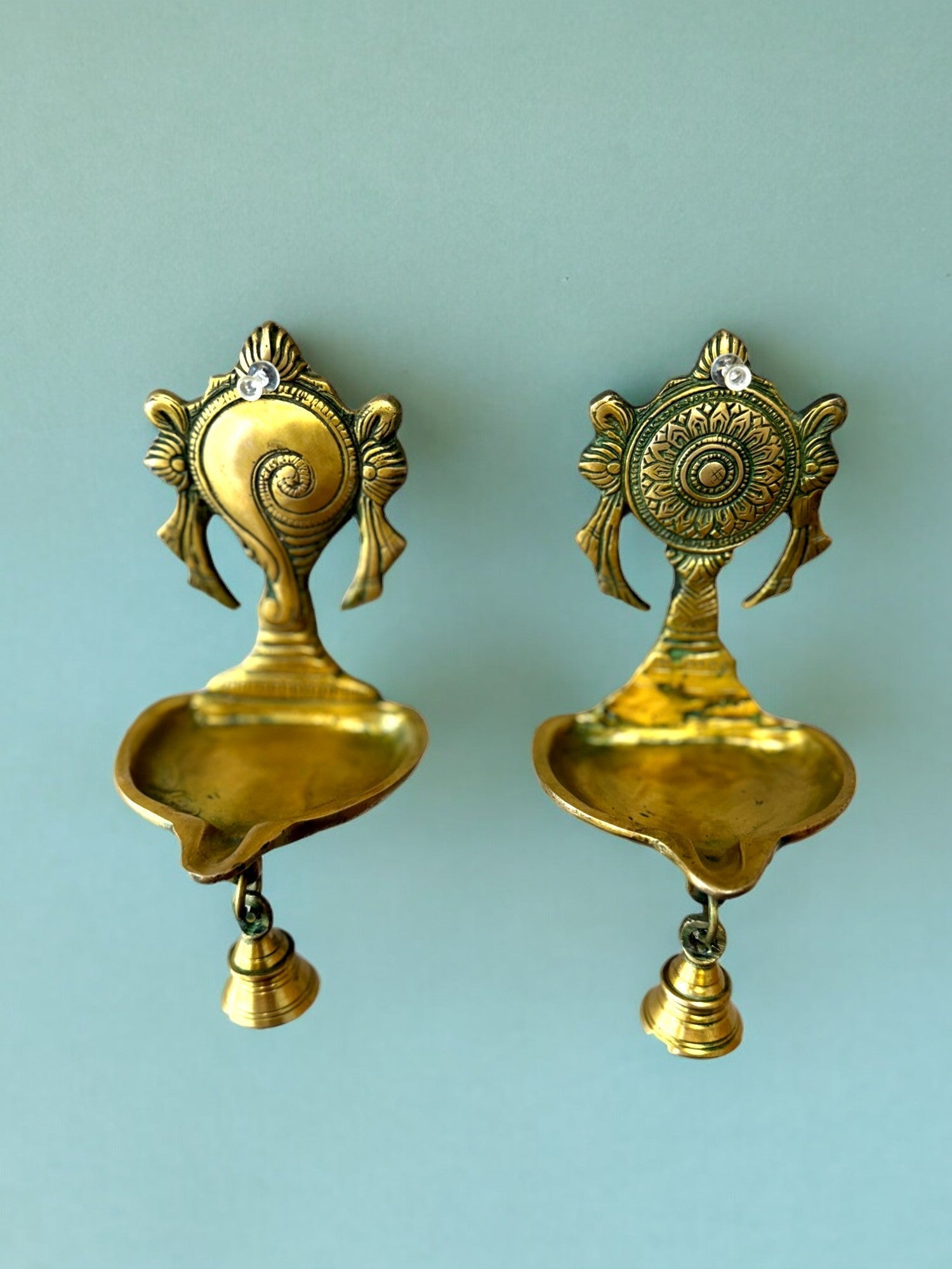 This beautiful diya pair are to be wall mounted and come with a bell to complete the traditional look.