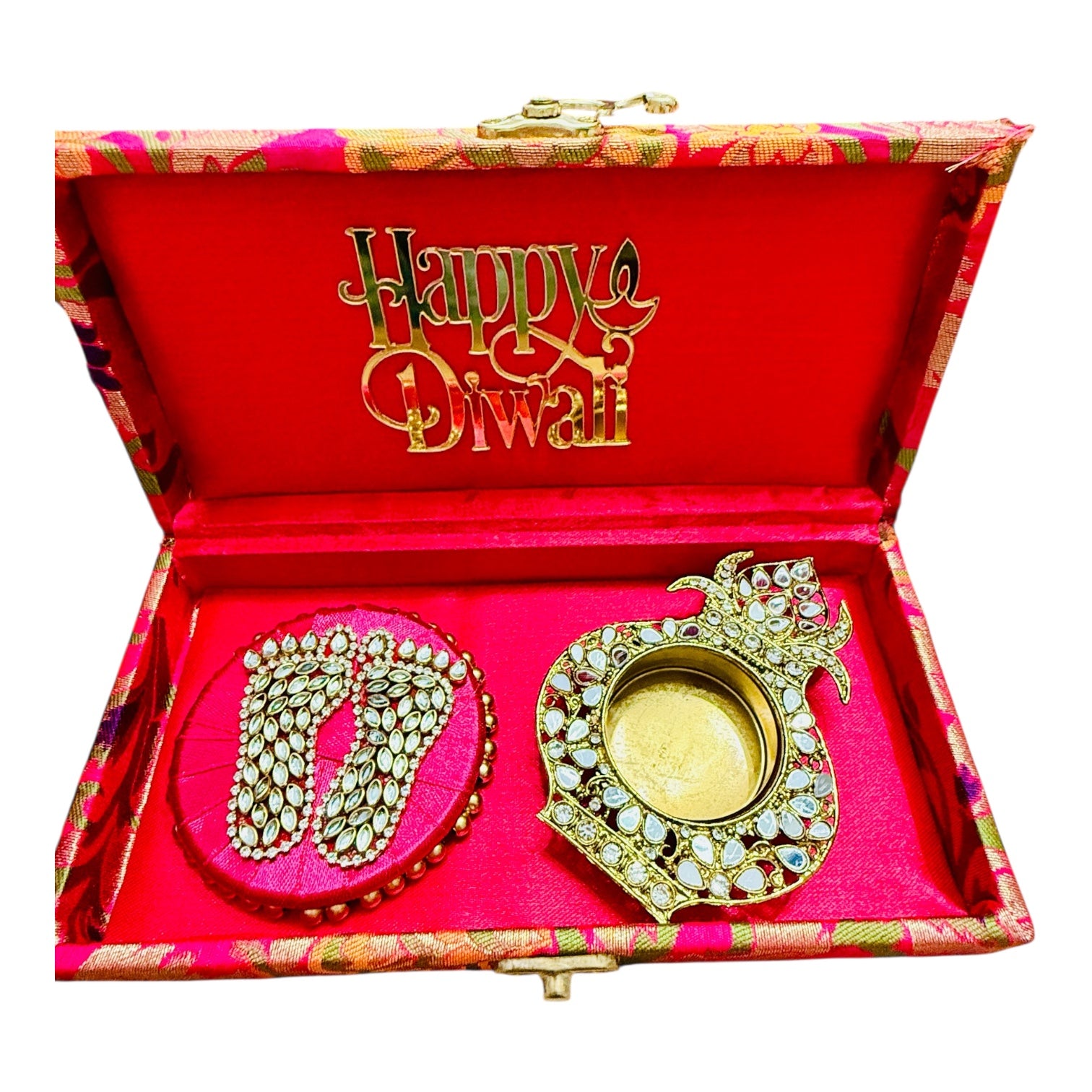 Gift Combo - Mirror T-Light Holder with Laxmi Charan in Brocade Box with Happy Diwali Cutout