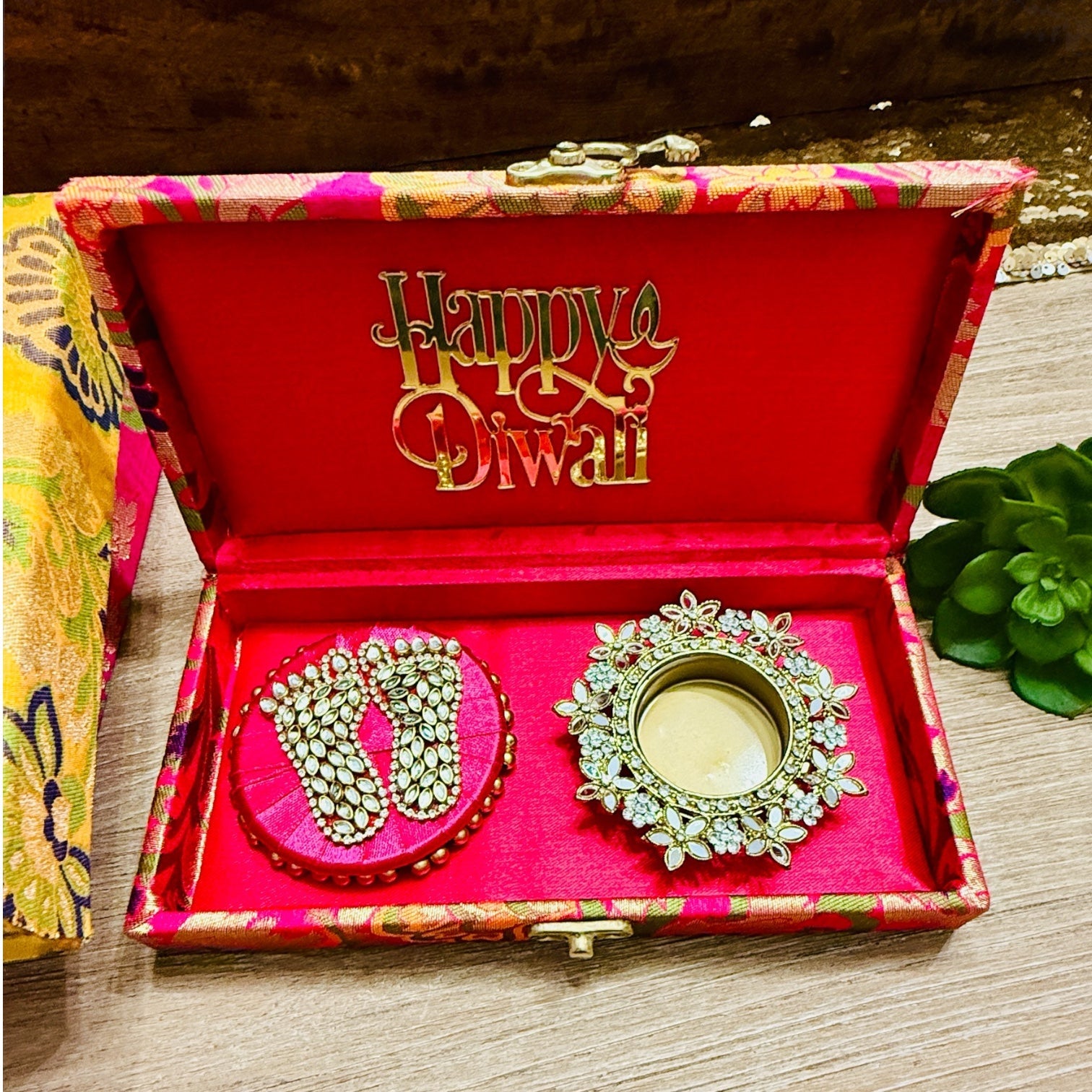 Gift Combo - Mirror T-Light Holder with Laxmi Charan in Brocade Box with Happy Diwali Cutout