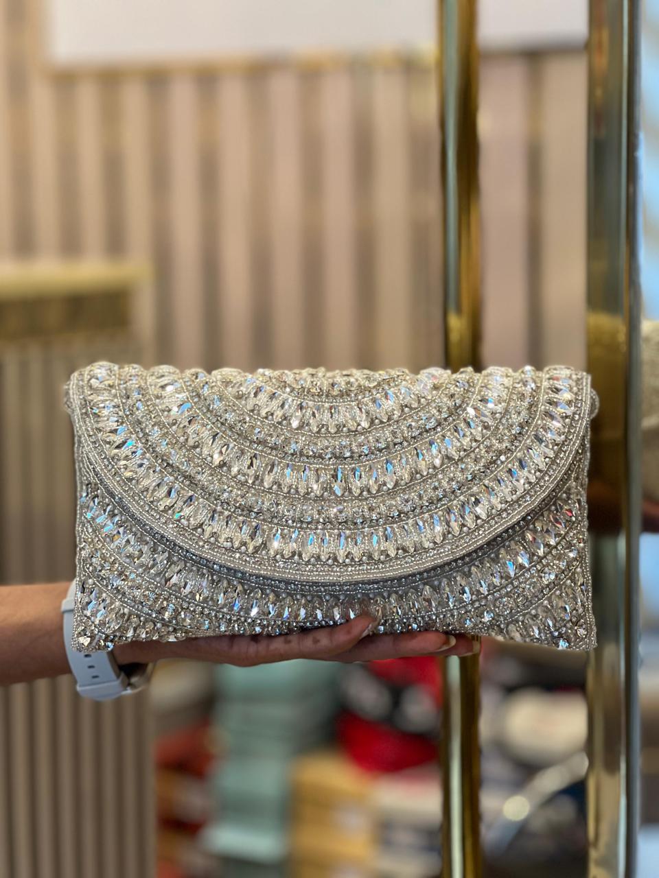 Spacious designer clutch with crystals all over front and beadwork at the back of the bag. The clutch measures 10 x 5 inches and can easily store phone, keys and lipstick. These clutches are neutral and go well with both traditional and modern wear. Comes with a beaded sling to shoulder hang the clutch