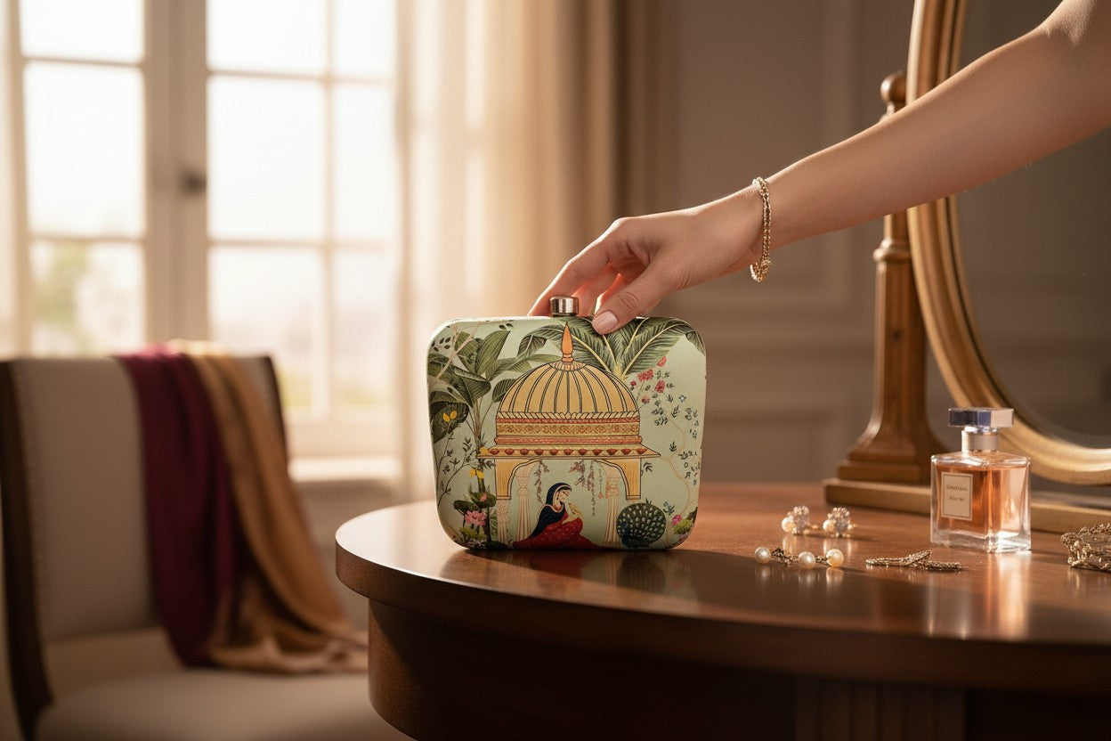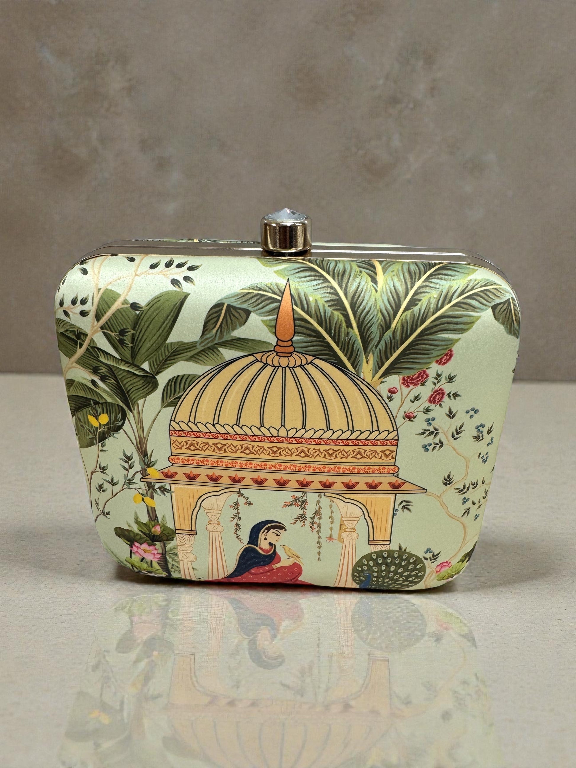 Designer Clutch with Women in Traditional Attire Sitting in a Domed Pavilion