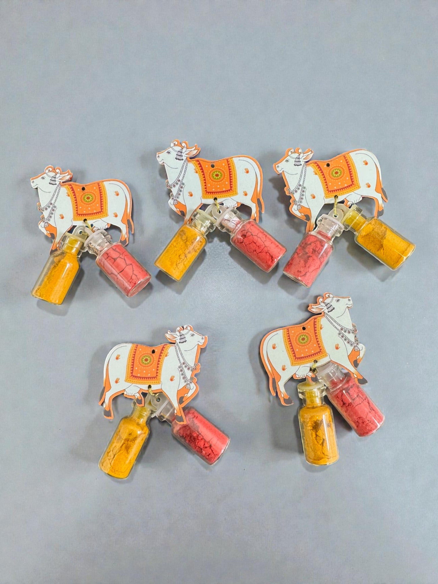 A compact and elegant that comes with a beautifully adorned tiny haldi kumkum bottles, perfect for traditional rituals and festive décor.