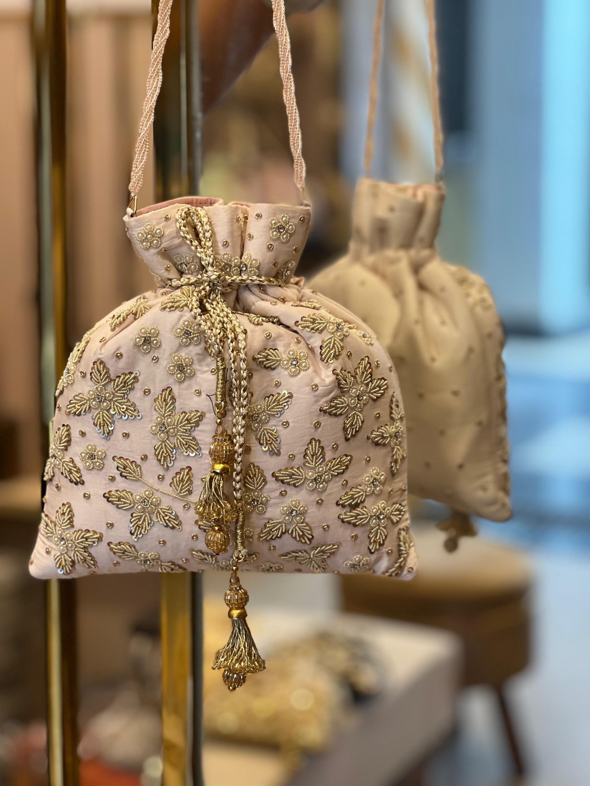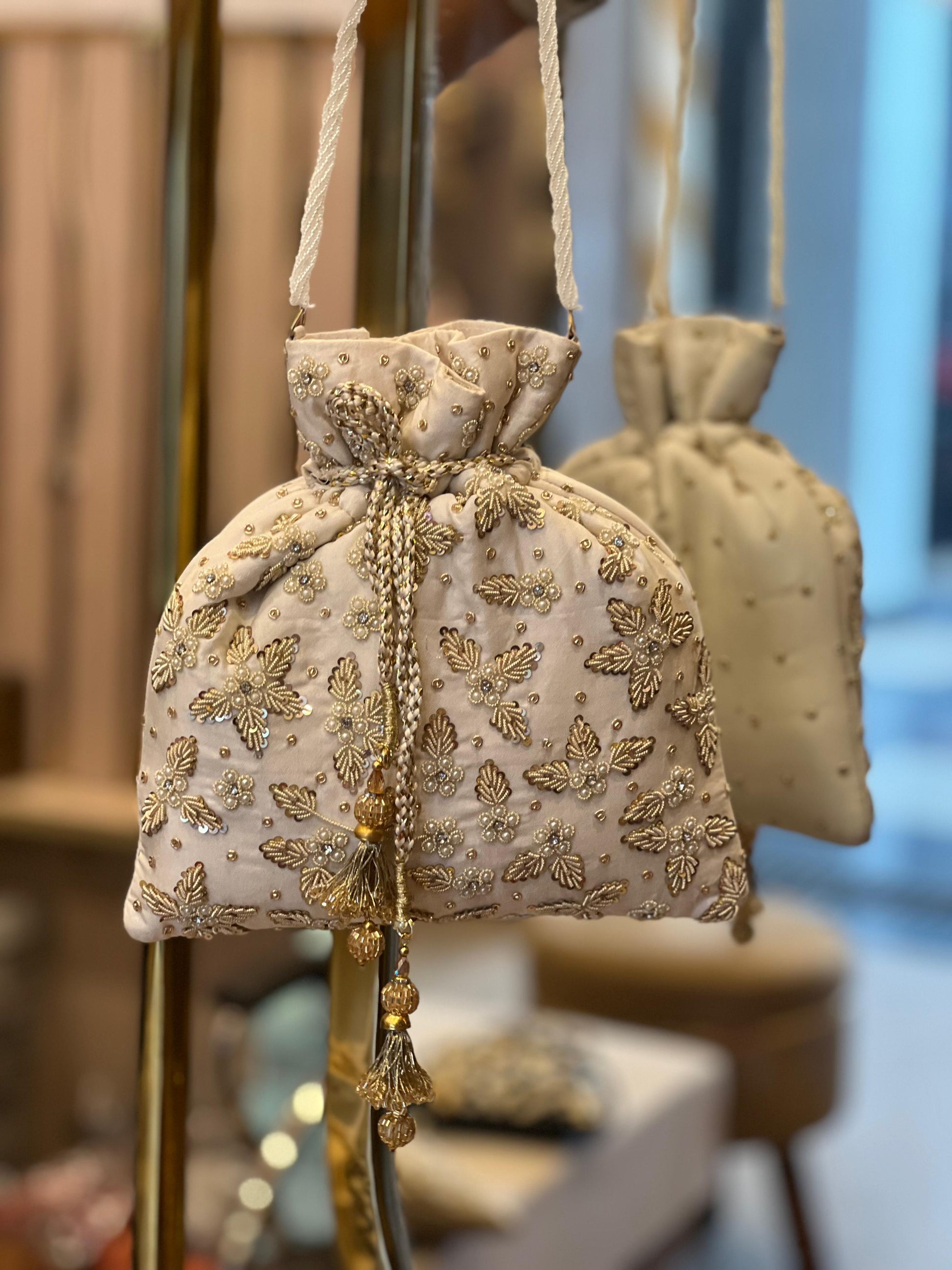 Zardosi Work Silk Potli Bag with Hand Embroidery & Designer Closing Thread